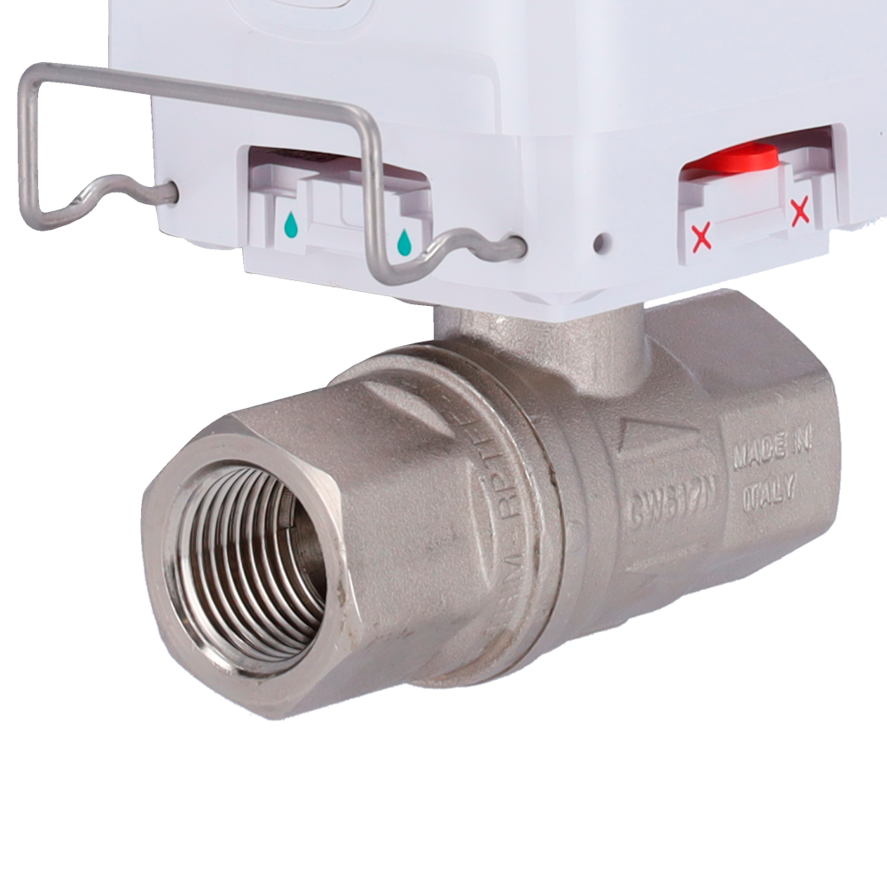 Electroválvula de cierre de agua – Válvula Bonomi de 1/2" (DN 15) – Compatible con tuberías de agua caliente y fría – Cierre de la válvula en menos de 5 segundos – Admite escenarios de automatización – Alimentación 4 baterías CR123A o a 7,5~14 VDC